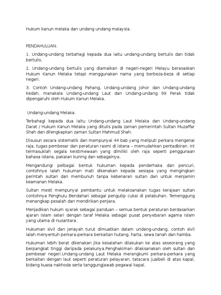 Hukum Kanun Melaka mempunyai 44 fasal yang menyentuh tentang bidang kuasa raja dan pembesar pantang larang dalam kalangan anggota masyarakat hukuman terhadap kesalahn jenayah awam dan undang-undang Melaka. Kesultanan Melayu Melaka dengan ciri-ciri Nyatakan ciri-ciri negara bangsa Kesultanan negara bangsa seperti kerajaan rakyat kedaulatan Melayu Melaka. Kerajaan manakah yang mewariskan ciri-ciri negara bangsa kepada Kesultanan Melayu Melaka.